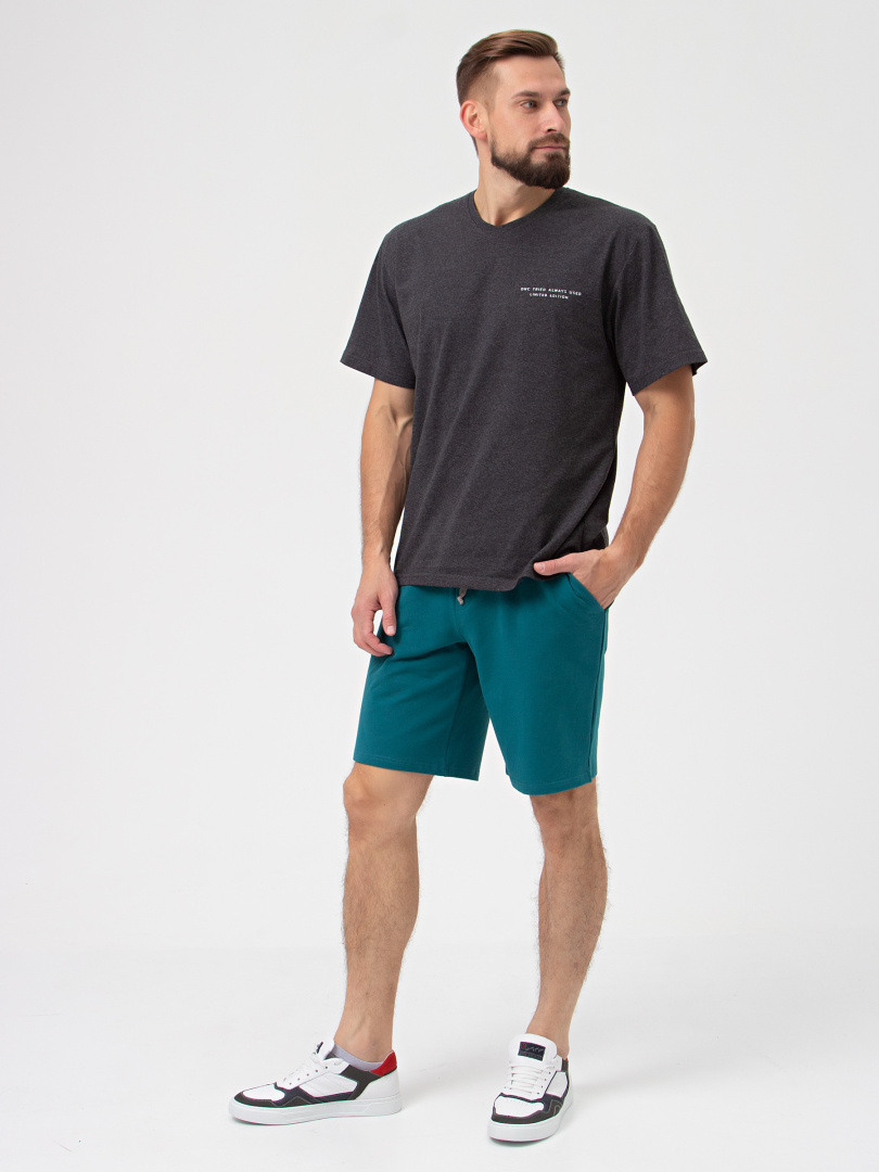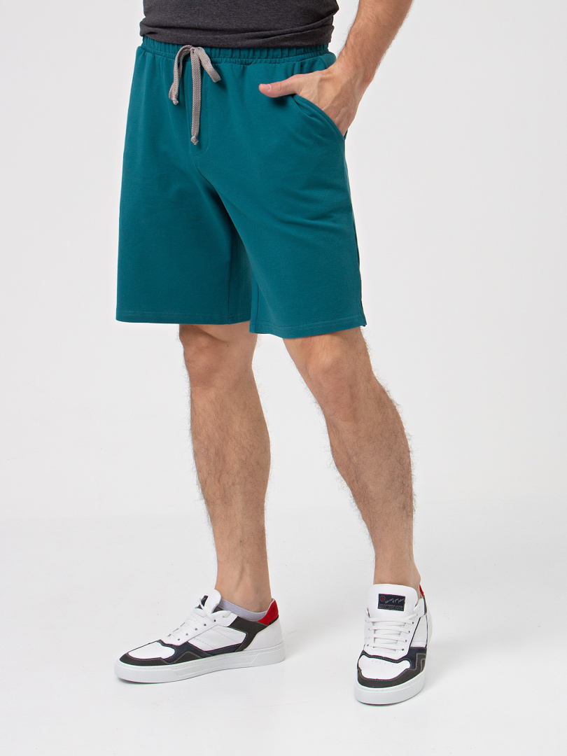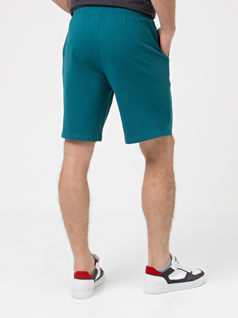 Шорты средней длины, выполненные из плотного трикотажного полотна - футер. Модель с удобной средней посадкой. Пояс на широкой резине со шнуром.  На передних половинках боковые карманы с наклонным входом. По боковым швам – небольшие разрезы. На передней половинке брюк – декоративная печать.