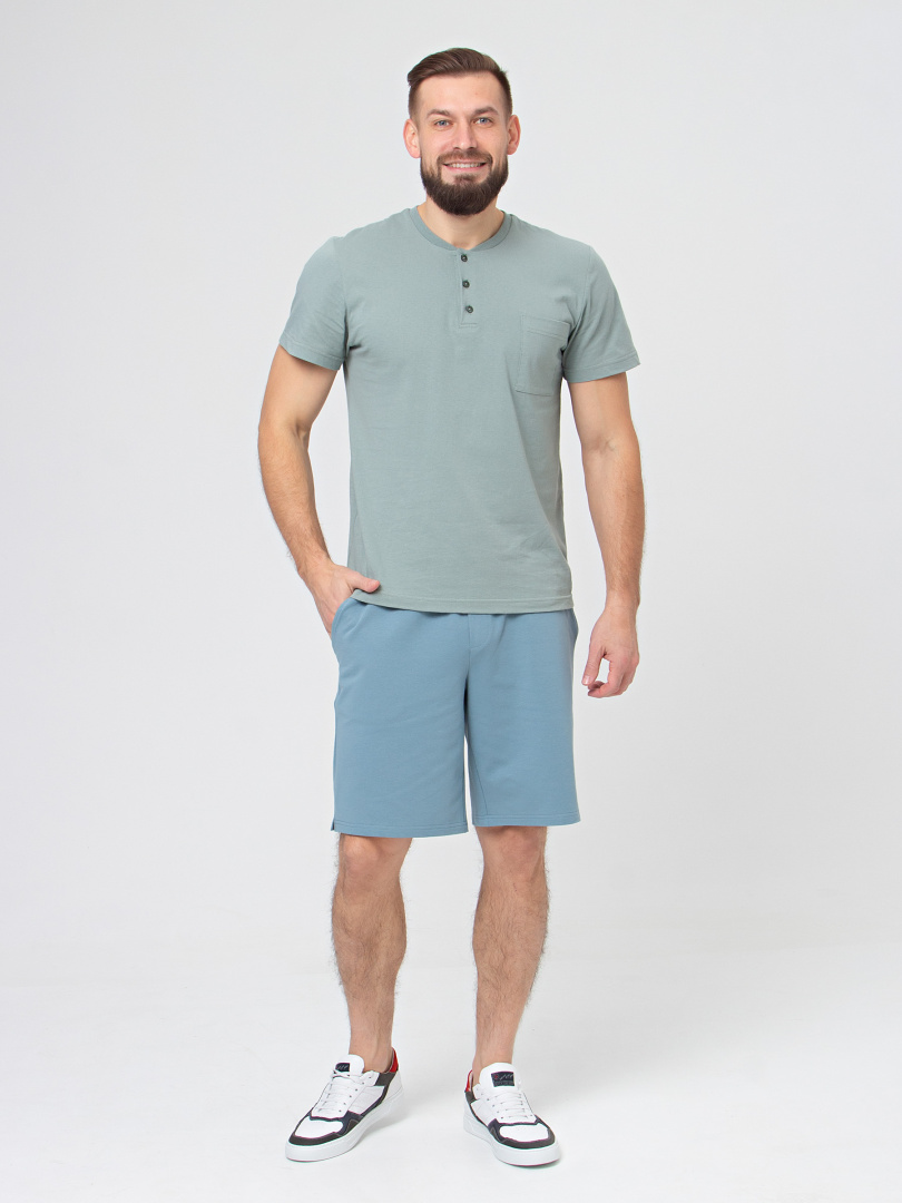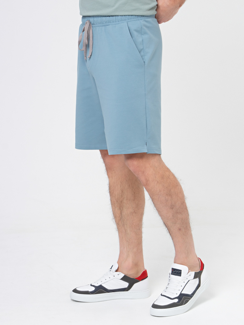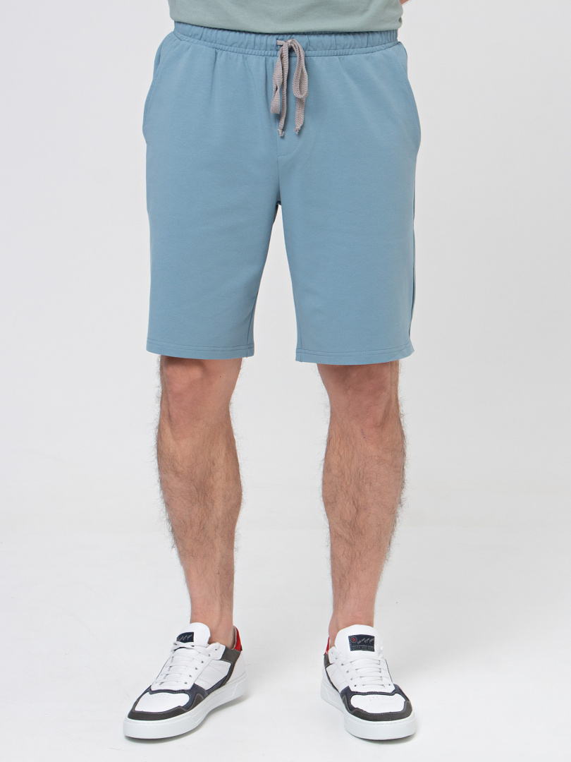 Шорты средней длины, выполненные из плотного трикотажного полотна - футер. Модель с удобной средней посадкой. Пояс на широкой резине со шнуром.  На передних половинках боковые карманы с наклонным входом. По боковым швам – небольшие разрезы. На передней половинке брюк – декоративная печать.