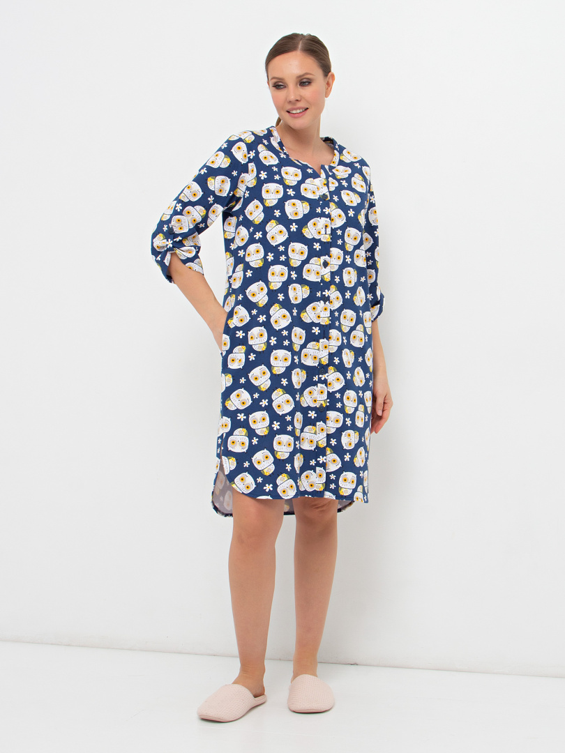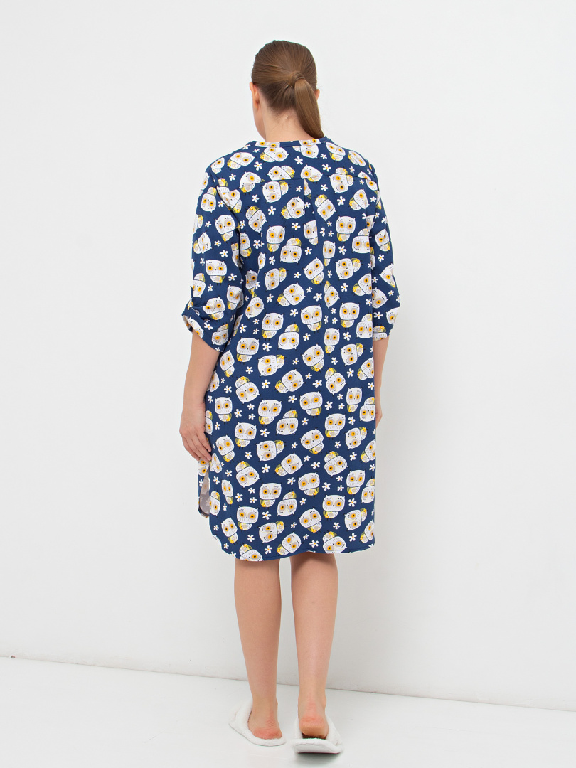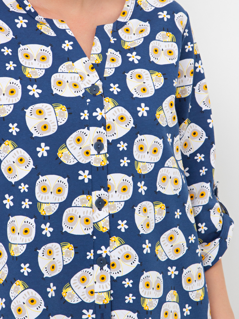 Женская трикотажная туника свободного рубашечного покроя с втачным рукавом длиной 3/4. По низу рукава – паты, застегивающиеся на пуговицу. Пата дает возможность регулировать длину рукава. Длина изделия – миди. У модели удлиненная спинка и боковые разрезы с закругленными краями. По спинке туника имеет кокетку. Изделие с застежкой на планке.