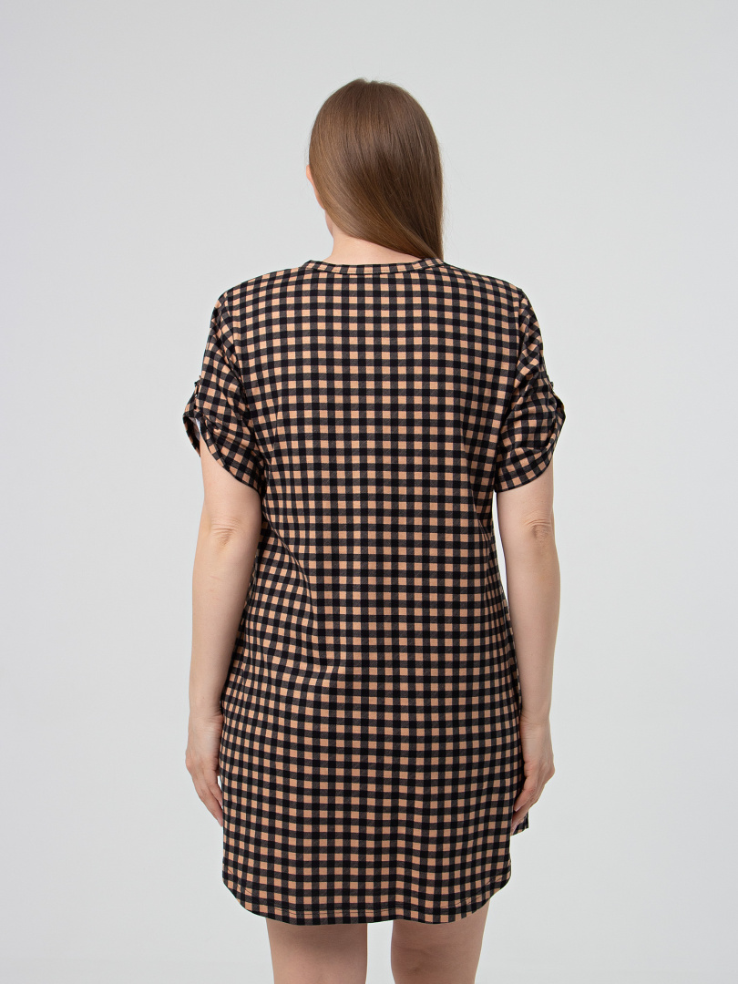 Туника выполнена из хлопкового трикотажа. Модель полуприлегающего силуэта с фигурным низом. Изделие с коротким рукавом.  По низу рукава – пата с застёжкой на пуговицу. Круглый вырез имеет косую планку с застёжкой на 2 пуговицы. По низу планки – складка. В боковых швах – внутренние карманы.