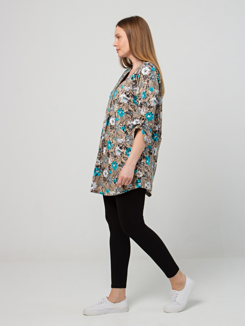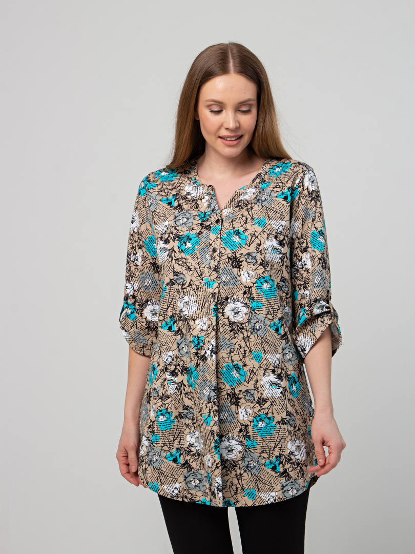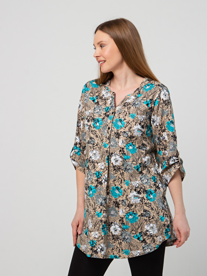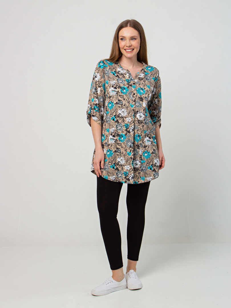 Туника выполнена из хлопкового трикотажа. Модель полуприлегающего силуэта с фигурным низом. Изделие с втачным ¾ рукавом. По низу рукава – пата с застёжкой на кнопку. Круглый вырез имеет косую планку с застёжкой на 2 кнопки.