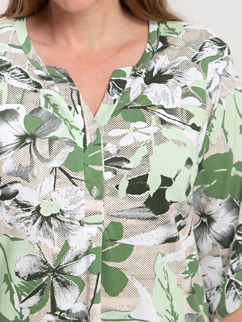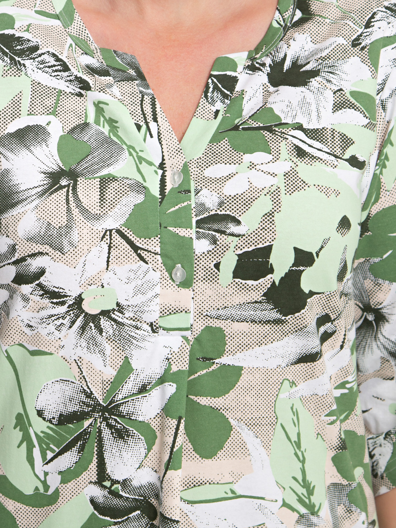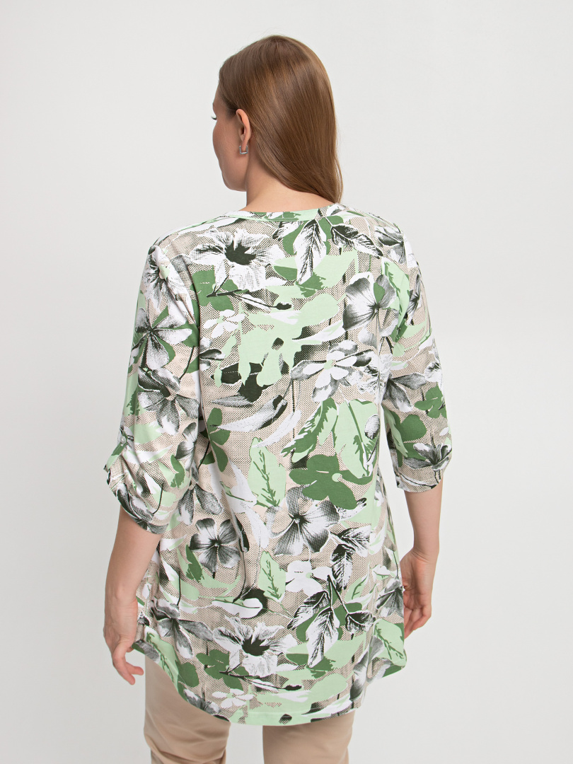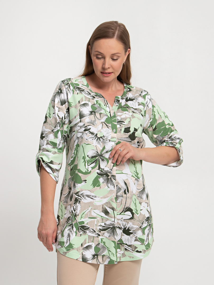 Туника выполнена из хлопкового трикотажа. Модель полуприлегающего силуэта с фигурным низом. Изделие с втачным ¾ рукавом. По низу рукава – пата с застёжкой на кнопку. Круглый вырез имеет косую планку с застёжкой на 2 кнопки.