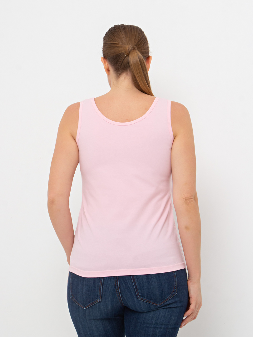 Майка из тонкого хлопка с лайкрой. Модель приталенного покроя. По пройме и горловине окантовка из того же материала. В левый боковой шов вшит «флажок» из отделочной ткани.
