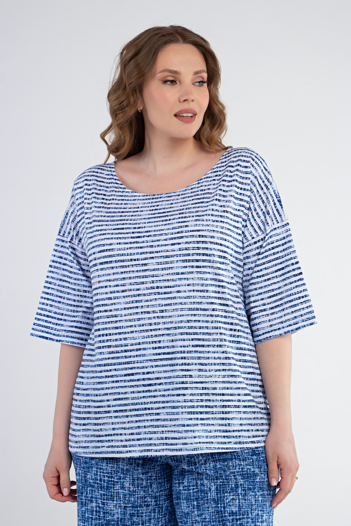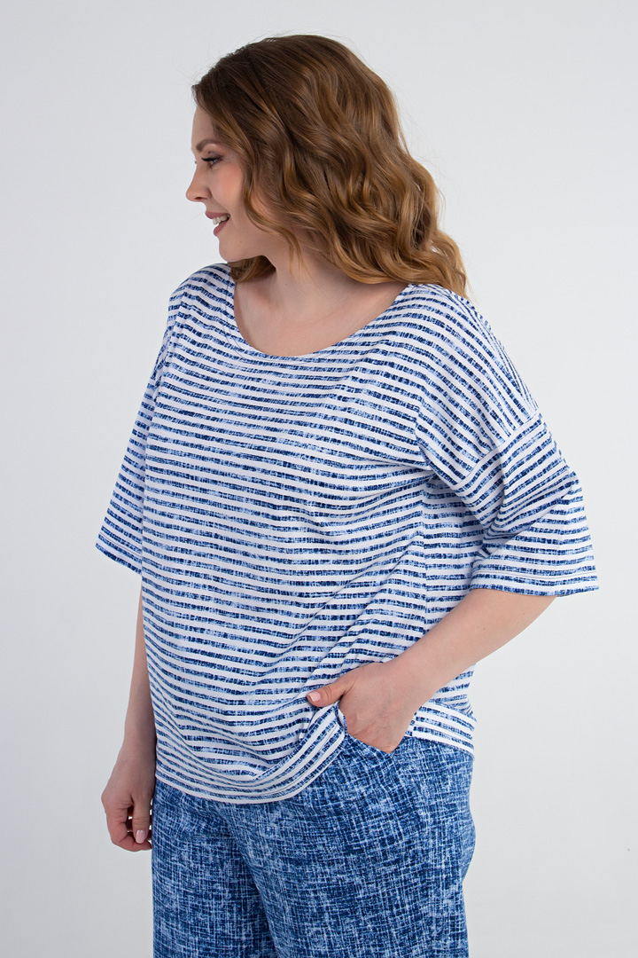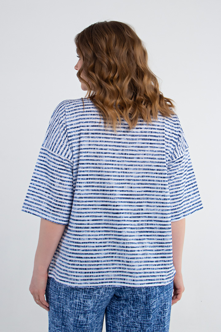 Футболка средней длины, выполнена из хлопкового трикотажа. Покрой свободный со спущенным рукавом до локтя. Вырез круглый.